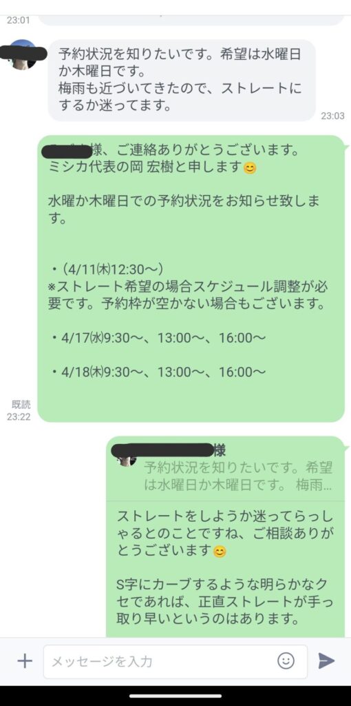 LINEのトーク画面で、「予約希望」とお伝えください。直近1週間の空き状況をお伝え致します。
